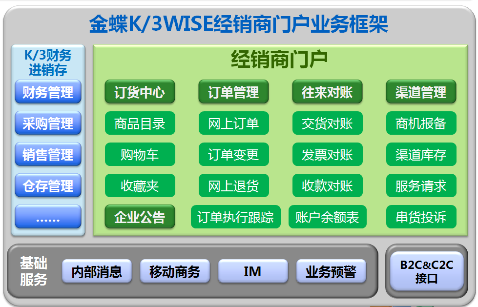 經(jīng)銷商管理系統(tǒng)主要以K/3WISE經(jīng)銷商門戶模塊為主,介紹經(jīng)銷商如何通過經(jīng)銷商門戶進(jìn)行溝通、訂貨、退貨、對賬等,形成金蝶K/3WISE經(jīng)銷商門戶解決方案。