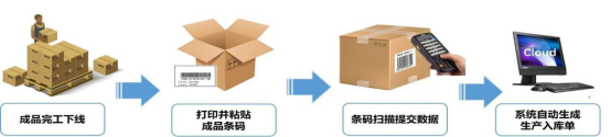 成品完工下線時(shí),將成品條碼打印并粘貼到包裝上,倉庫人員先掃描生產(chǎn)訂單,并逐一掃描成品條碼,系統(tǒng)自動關(guān)聯(lián)生產(chǎn)匯報(bào)單生成產(chǎn)品入庫單。