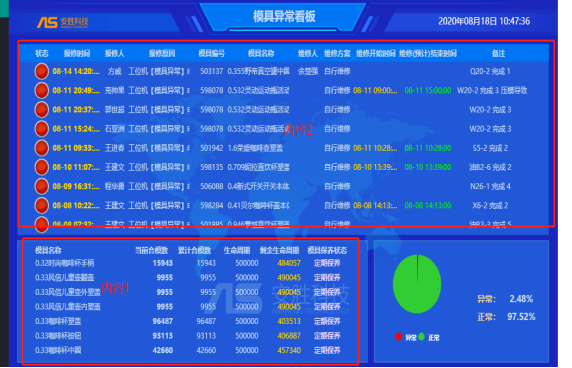 建立模具保養(yǎng)方案,保養(yǎng)計劃,根據(jù)現(xiàn)場生產(chǎn)實際情況記錄上模下模記錄,車間可以實時查看模具相關報表。